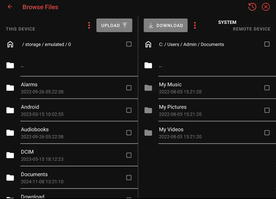 Similar to desktop platforms, this feature allows you to transfer and manage files and folders between your local Android device and a remote endpoint.