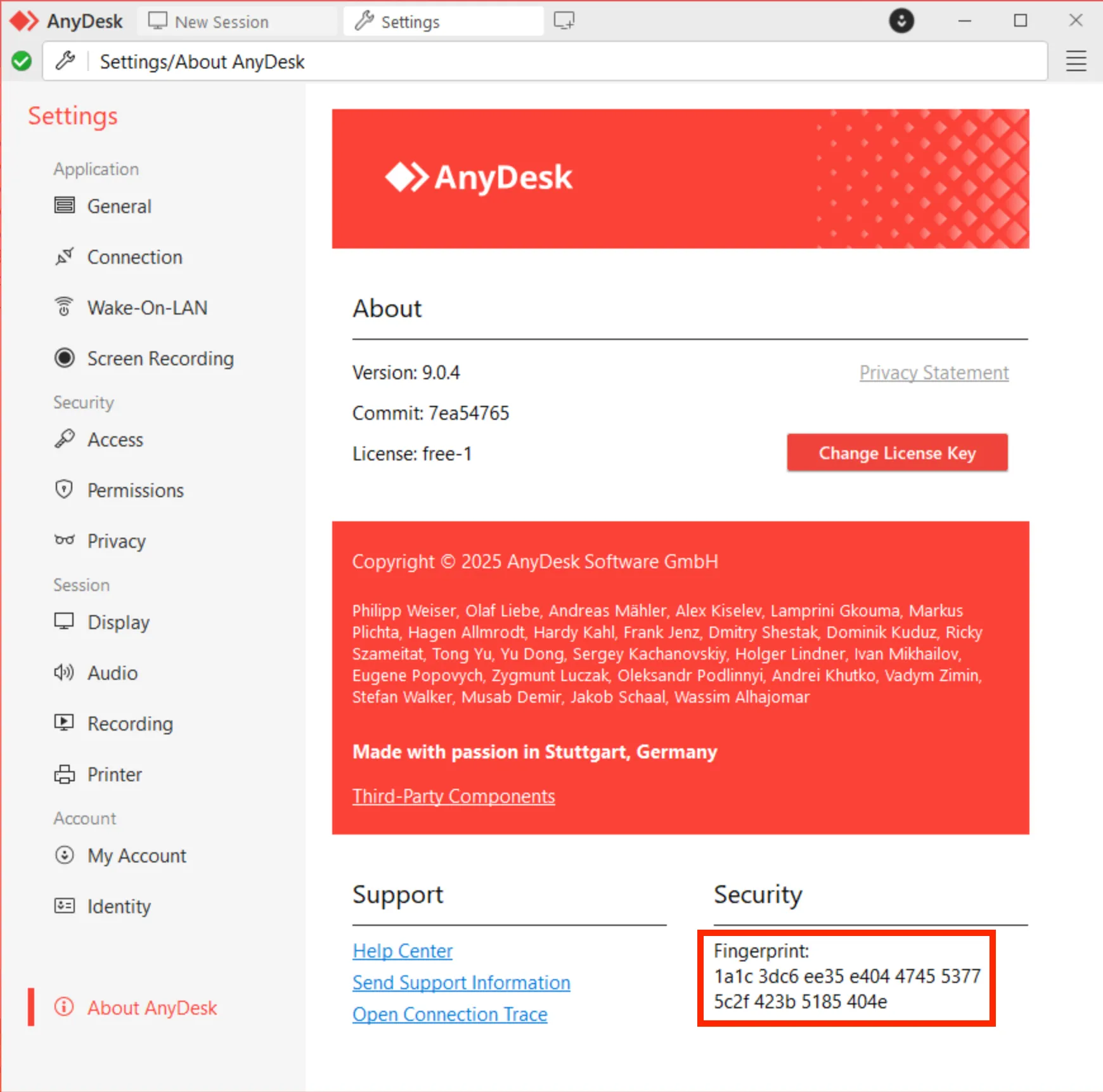 For an extra security check, verify the fingerprint. If you want to be extra cautious, compare the fingerprint shown in AnyDesk with the one you expect. The fingerprint for your AnyDesk client can be found in Settings > About AnyDesk > Security > Fingerprint.