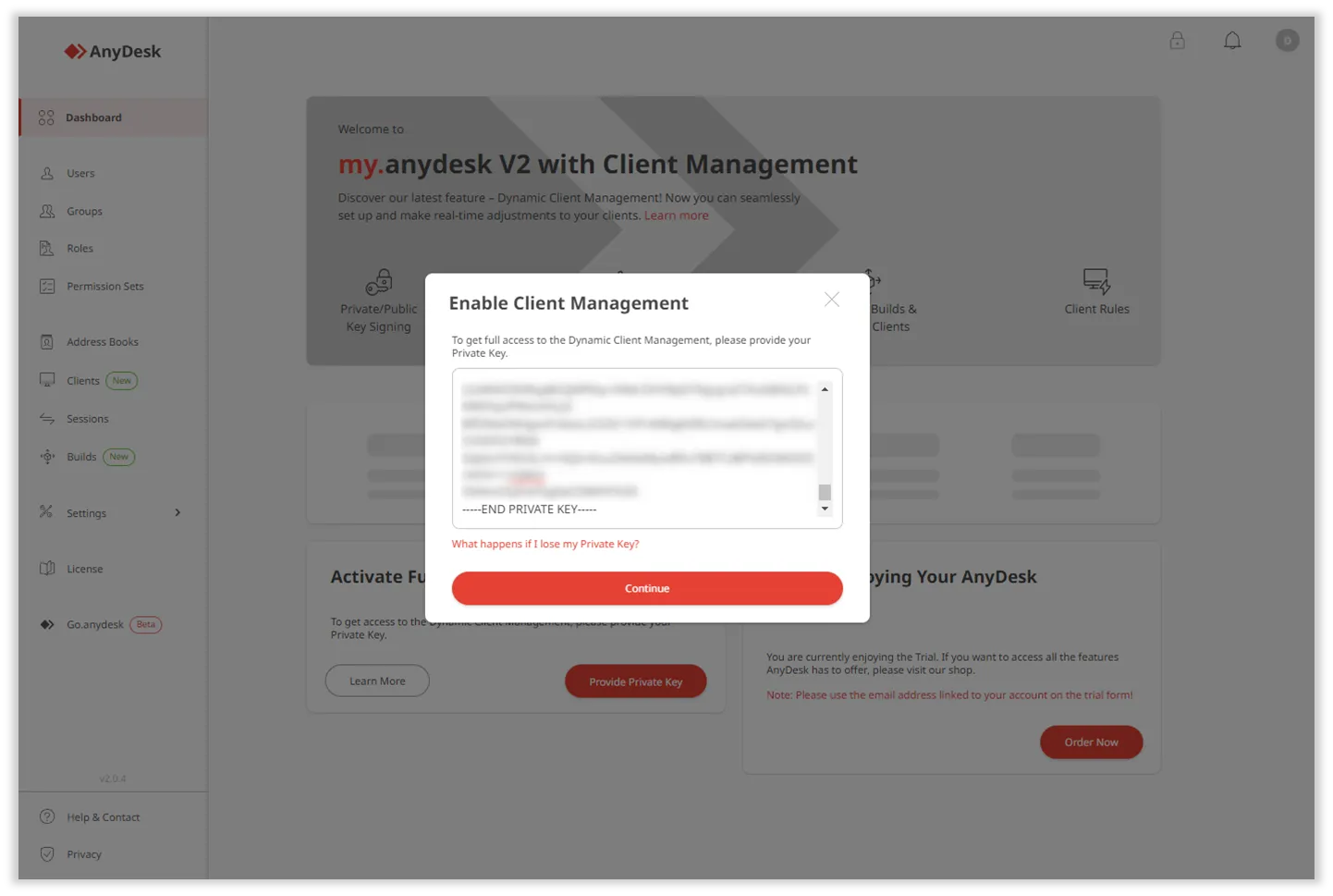 Sign in to my.anydesk II and in the Activate Central Management section, click Provide Private Key.