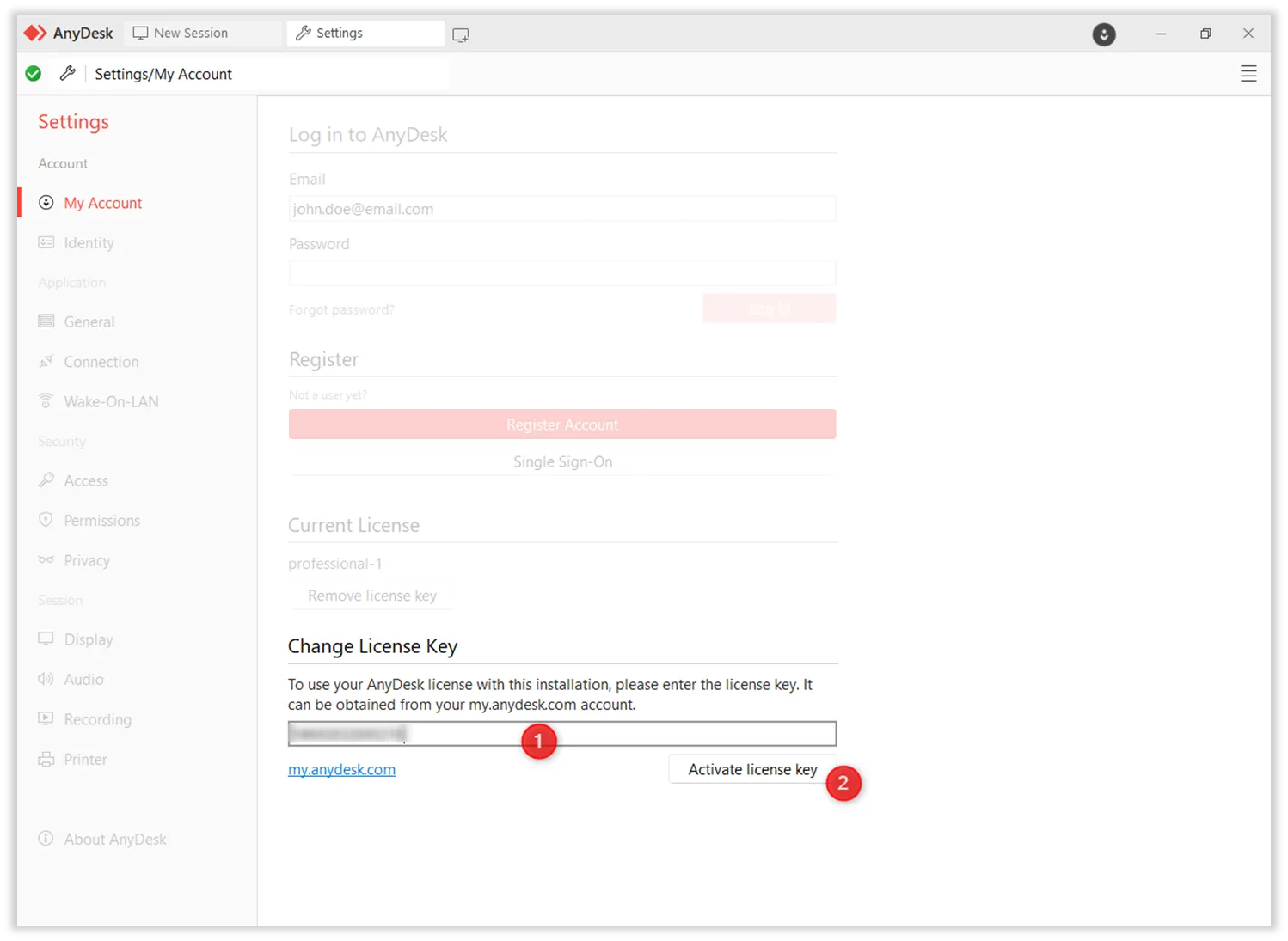 Open your AnyDesk client and in the upper-right corner of the client, click image.png > Change License Key…. changelicense kez-1