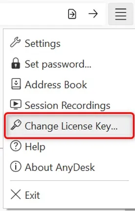 Open your AnyDesk client. In the upper-right corner of the client, click  settings button > Change License Key….