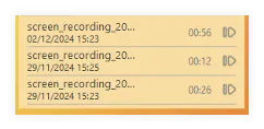 To access all recordings, click the Folder icon. This opens a list of all recorded videos, showing their name, size, and date.