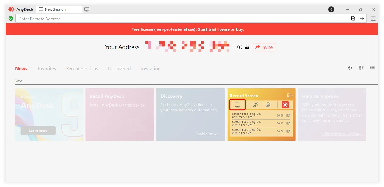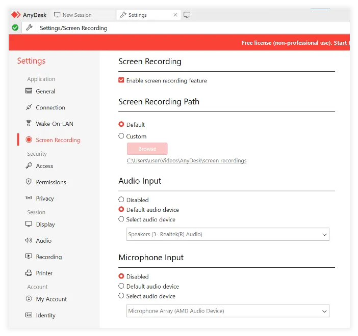 Screen Recording is enabled by default in every AnyDesk Client, making it accessible to all users. However, administrators can disable this feature in the Settings if it is not required.