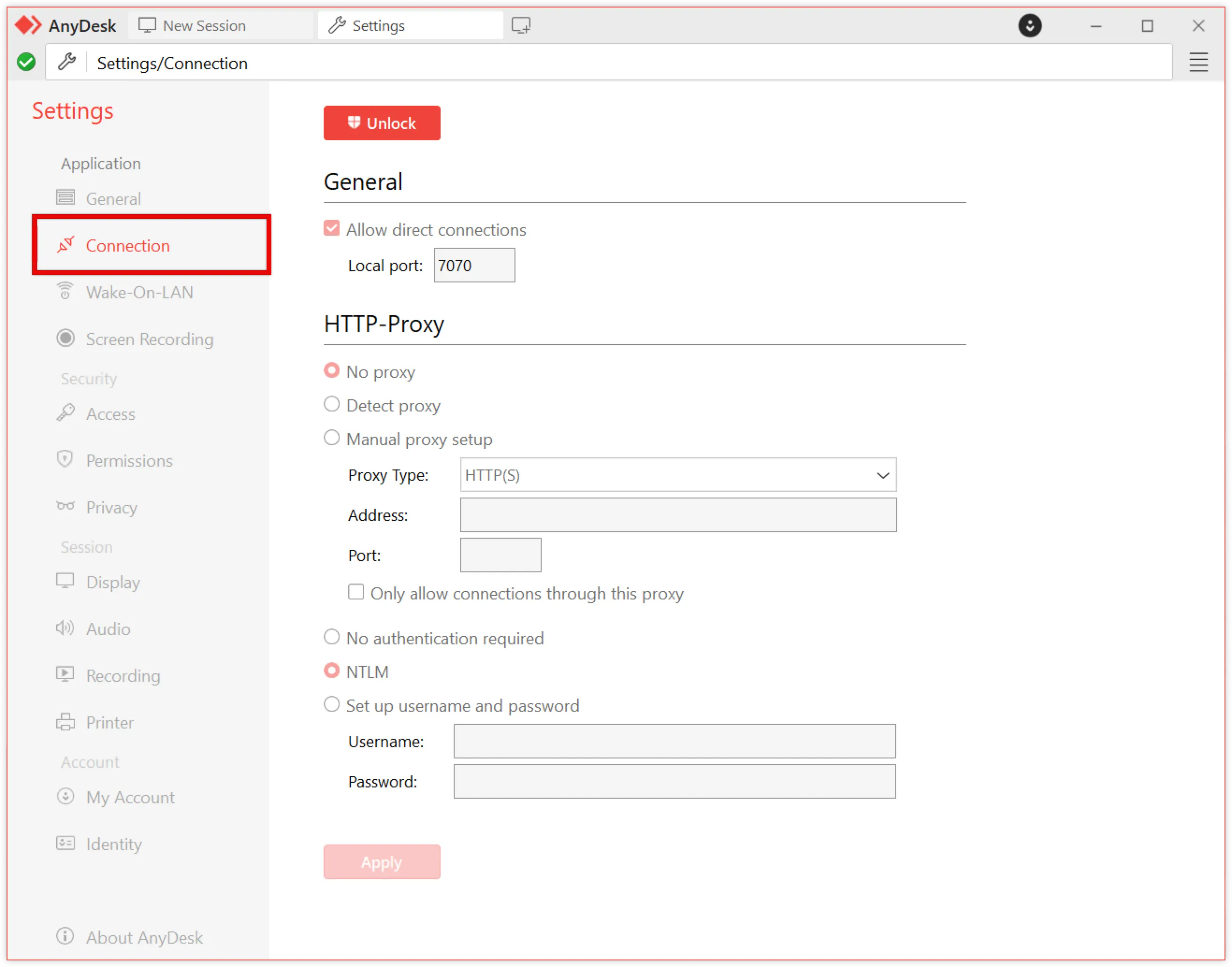 This section manages how AnyDesk communicates over networks, including direct connections, ports, and proxies. To modify the Connection settings, click at the top of the Connection section.