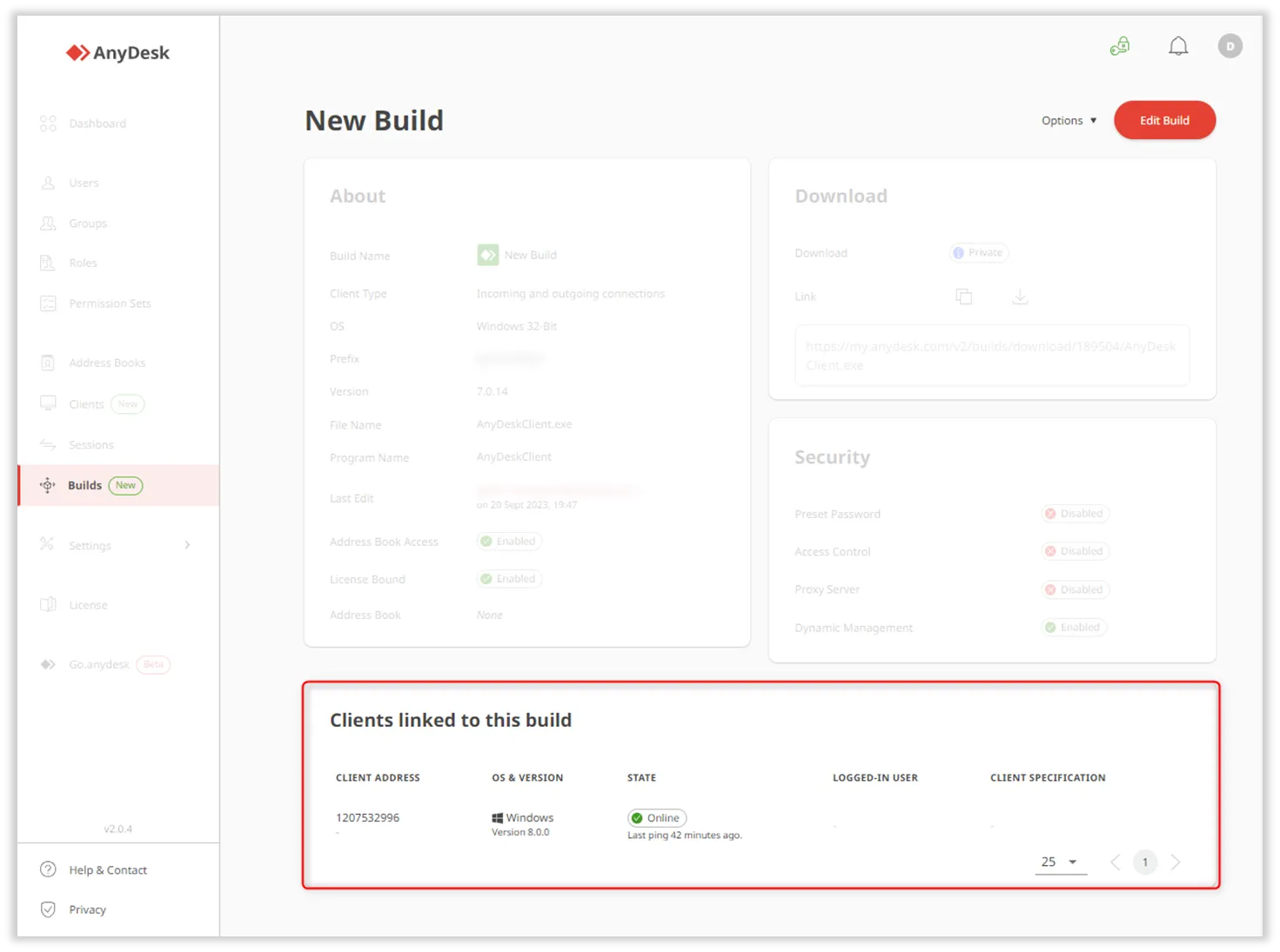 If you want to adjust the settings of all clients linked to the build, such as security settings, add or remove access to certain features, you can easily do that in my.anydesk II.